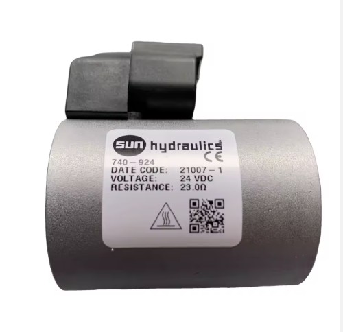 The Sun Hydraulics 740 Series Solenoid Coil (740924) is a durable 24 VDC coil designed for reliable hydraulic valve operation. Available in 17W and 25W versions, it features a secure Deutsch DT04-2P connector for stable electrical performance. The zinc-nickel plated steel housing provides up to 1000 hours of salt fog corrosion resistance, while the IP69K rating ensures protection against dust, moisture, and high-pressure wash downs. Ideal for industrial and mobile hydraulic applications requiring long-lasting, dependable performance.